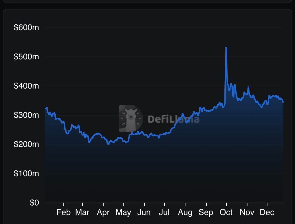On Oct. 1, launchpad-related activity spiked, with volume reaching more than $530 million. By December, total value locked stood at about $342 million, while seven-day fees reached $7.51 million and revenue totaled $6.77 million.