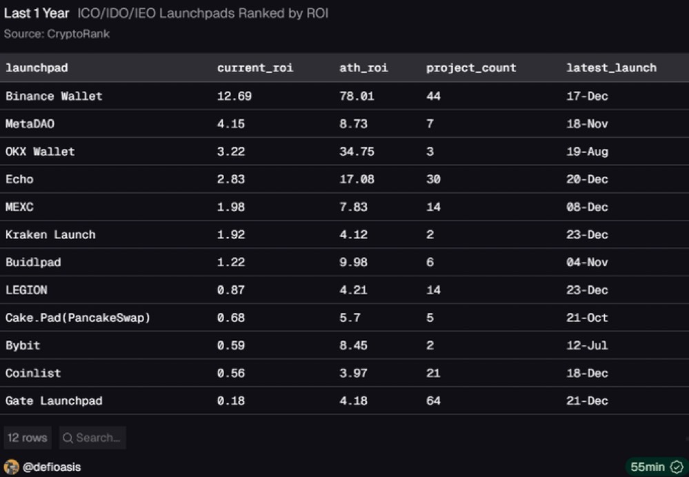 Data compiled by DeFi Oasis and CryptoRank shows Binance Wallet leading all major ICO, IDO, and IEO platforms by a wide margin.