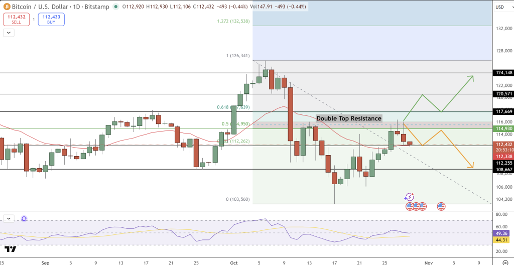 Bitcoin (BTC/USD) is trading near $112,400 after retreating from the $117,600 double-top resistance, where buyers failed to sustain momentum. The daily chart shows BTC forming lower highs within a short-term descending channel, signaling a cooling phase after last week’s rally.