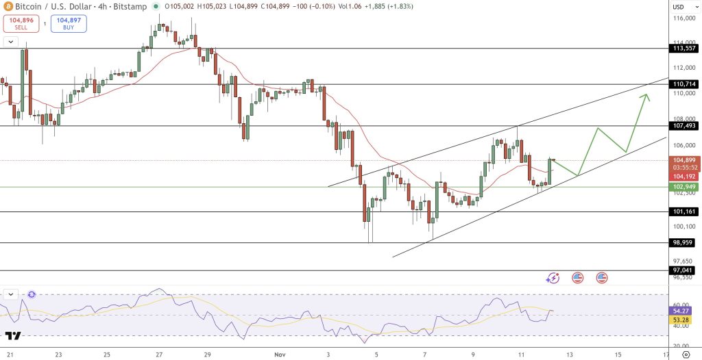 From a technical perspective, Bitcoin price prediction is slightly buullish as BTC remains within an ascending channel, showing controlled momentum. The price recently rebounded from $102,950, forming a bullish engulfing candle that signals renewed buying pressure.
