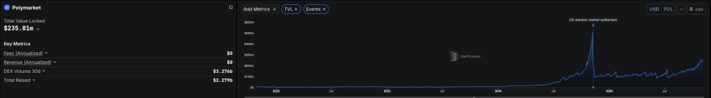 - Polymarket gained popularity in 2024 during the U.S. elections, with its TVL recovering to $230 million by November 2025.