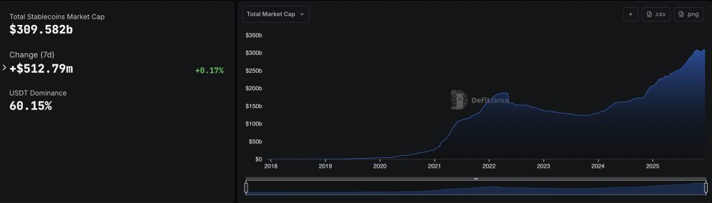 The launch comes as the stablecoin market continues to grow rapidly. Data from DefiLlama shows the total stablecoin market capitalization at roughly $309 billion, with Tether’s USDT accounting for more than $186 billion and Circle’s USDC close to $78 billion.