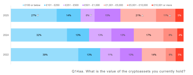 The share of users holding £1,001 to £5,000 in crypto rose to 21%, up four percentage points from 2024, while those holding £5,001 to £10,000 increased to 11%, up three points.