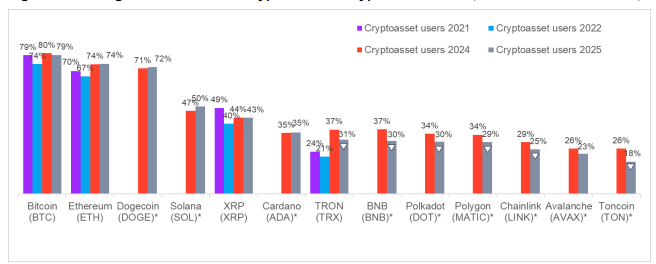 Bitcoin remains the most commonly held cryptoasset, owned by 57% of users, and recorded a five-percentage-point recovery after several years of declining ownership.