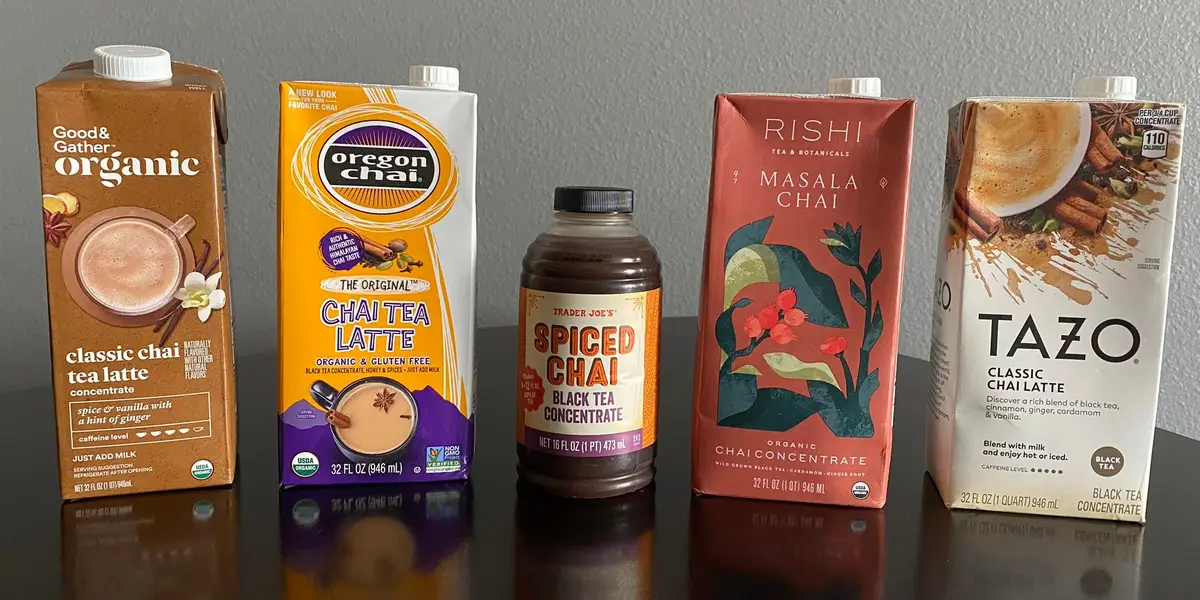 - I tasted chai concentrates from Good & Gather, Oregon Chai, Trader Joe’s, Rishi, and Tazo.
