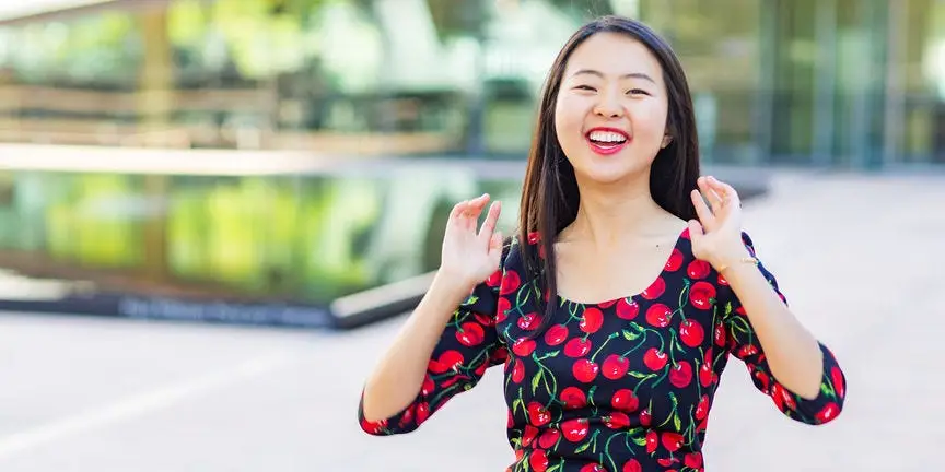Woman in colorful dress smiling with arms outstretched