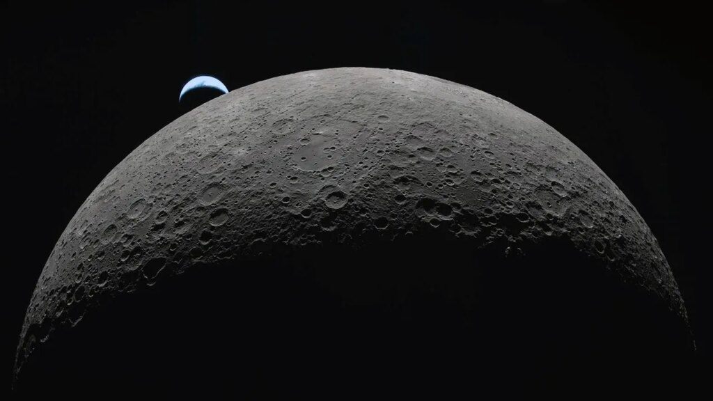 Earth sets at 6:41 p.m. EDT, April 6, 2026, over the Moon’s curved limb in this photo captured by the Artemis II crew during their journey around the far side of the Moon. (NASA)